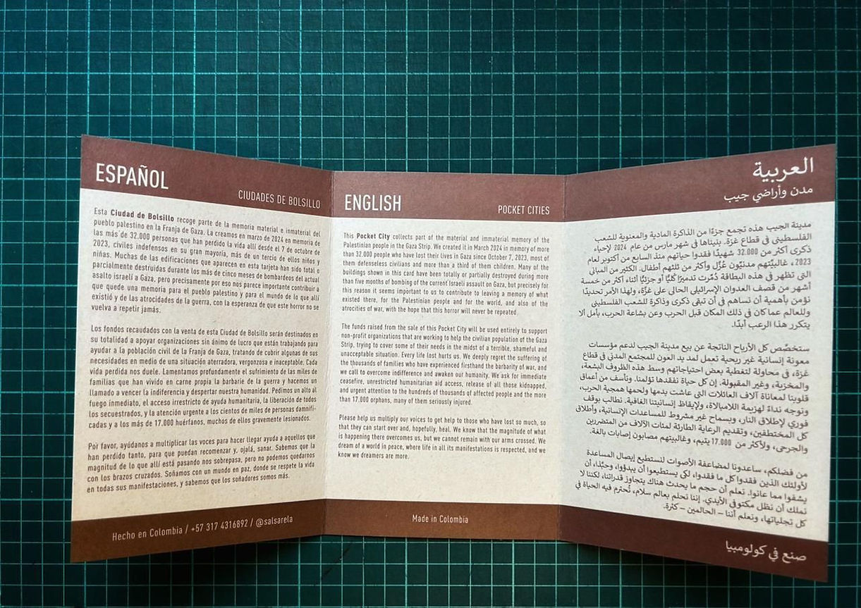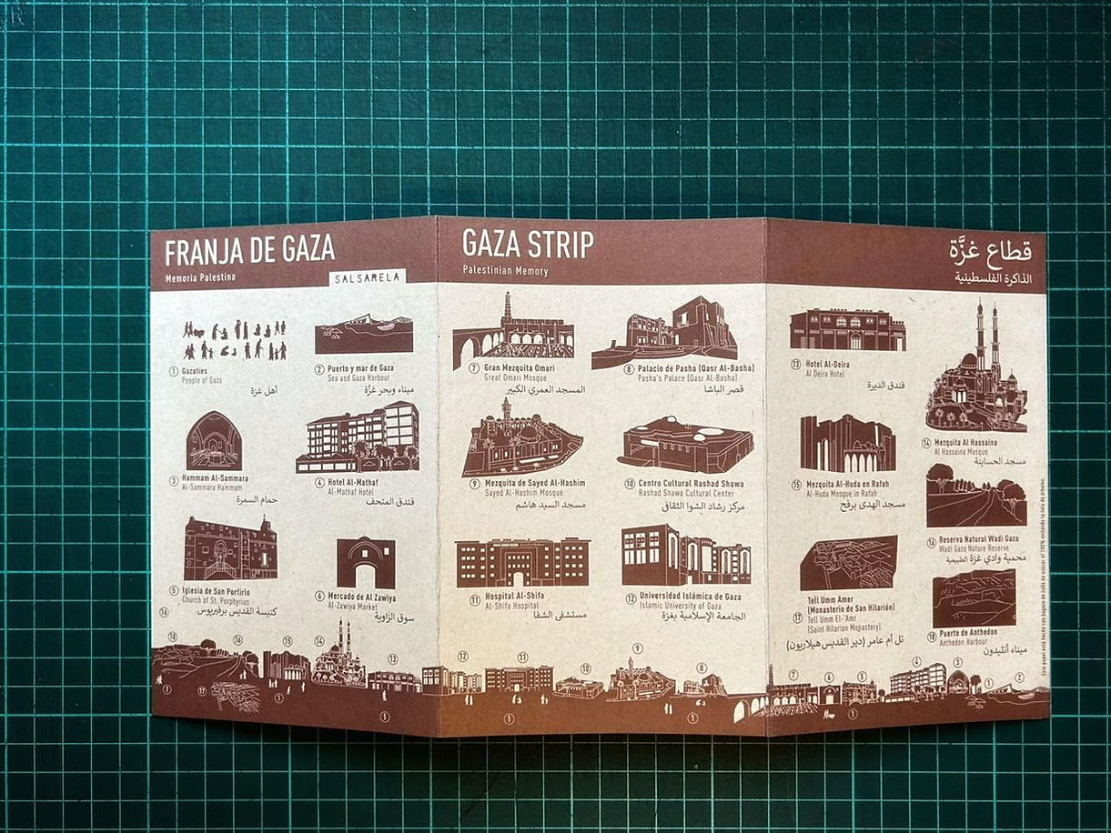 El diseño incluyó muchas siluetas de gazatíes con el propósito de representar que son los civiles quienes han sido los más afectados con el genocidio. Esta vez el equipo no pudo contactar con un local debido a la distancia cultural y por el idioma, pues es la primera vez que contemplan hacer una ciudad donde el árabe es el idioma origen. Tras la investigación, se procede con la ilustración y diseño, y posteriormente, el reto del idioma: “De las cosas más difíciles fue conseguir quien tradujera los textos al árabe pues realmente no conocíamos a nadie que lo hablase y nos parecía fundamental que estuviera en tres idiomas: español, inglés y árabe. Finalmente, un poeta refugiado egipcio Ahmad Mohsen nos ayudó, donó su trabajo y logramos hacer los folletos”.