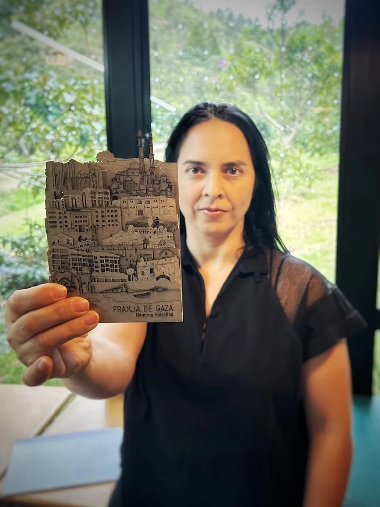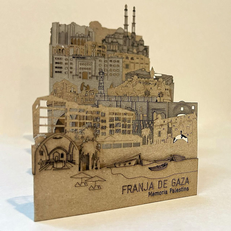 Durante el proceso de creación de la Tarjeta de la Franja de Gaza, lo más interesante para el equipo fue el tema de las personas, ya que las siluetas representan a los más de 34.000 gazatíes asesinados desde el 07 de octubre. Adriana recalca que “también nos duelen las 1.200 víctimas civiles israelíes del atentado de Hamas, o las miles de víctimas anteriores al 07 de octubre que este conflicto ha dejado. Somos defensores de la vida. Nunca la solución será generar más dolor”. Similarmente, quisieron representar la importancia de la religiosidad (tanto islámica o cristiana) en la cotidianidad en Gaza, pero sin dejar de lado la riqueza arquitectónica, por lo que incluyeron hospitales, universidades, museos, hoteles, mercados, monumentos arqueológicos, entre otros.
