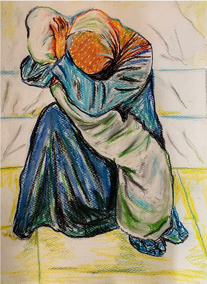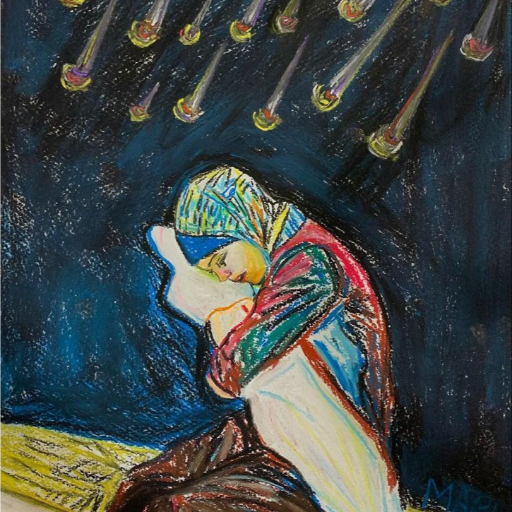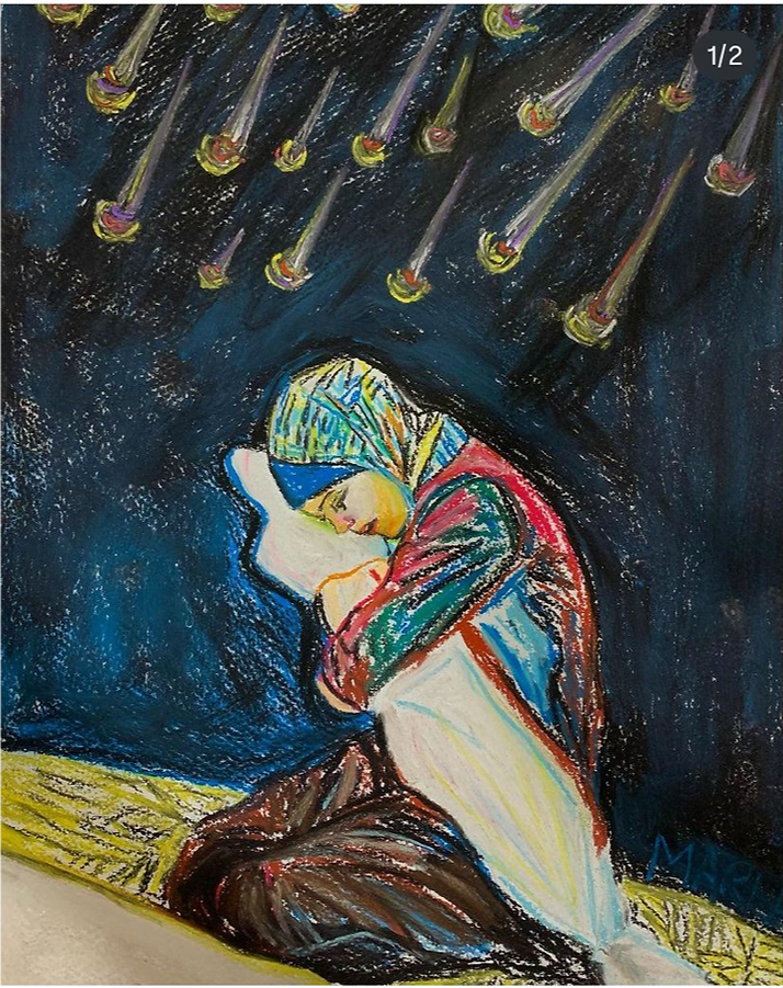 Su primer retrato sobre el genocidio es una replica de la imagen tomada por Mahmoud Bassam, un fotógrafo palestino, que la mañana del 21 de octubre del 2023, capturó una madre desolada que sostiene a su bebé asesinado. La obra de Marla, hecha con tiza pastel, que es el material que ella investiga, se titula “I wish they were shooting stars”, que traduce “Desearía que fuesen estrellas fugaces”, refiriéndose a las bombas que caen desde el cielo.